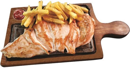Pechuga a la plancha gratinada, salsa bbq, salsa champiñones + papa a la francesa y patacón