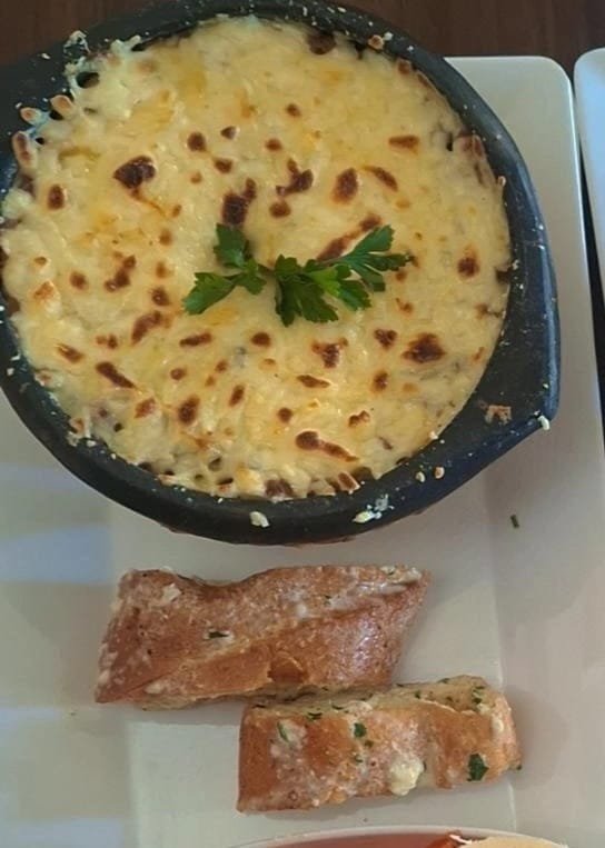 Carne molida con salsa la bolañesa, pollo con salsa champiñones y queso + pan baguette